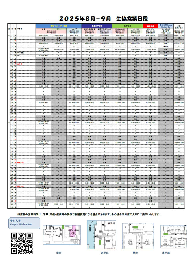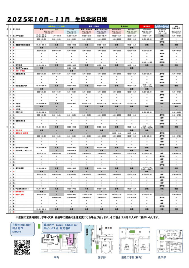 店舗の営業時間は、学事・天候・疫病等の関係で急遽変更になる場合があります。その場合はお店の入り口に掲示いたします。